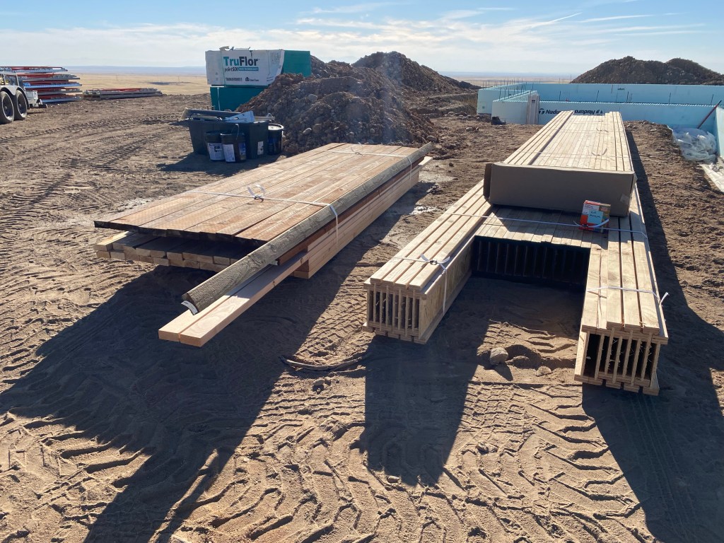 Our flooring package was delivered on Tuesday. When I imagined spending big money on flooring, I pictured pretty wood colors and carpet, not dropping a small fortune on some lumber and OSB. I’m learning that the bones of the house – which is important to build strong from the get go – is way more expensive than HGTV lets on.