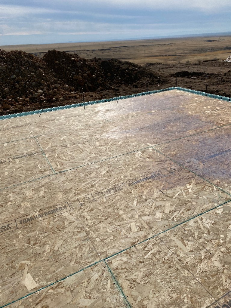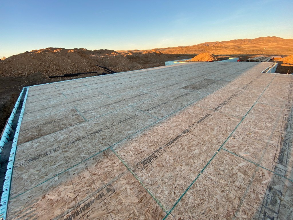 I spent hours sealing the subfloor with waterproof gunk and a 9-inch roller, and let me tell you, it was pretty much the equivalent of mopping with a tiny, inefficient sponge; our house sure felt bigger than it looks to me! We have some precipitation in the forecast for next week, and we wanted to make sure the exposed OSB was ready to withstand it. This will also be nice for wet shoes walking on it during framing and other interior work.