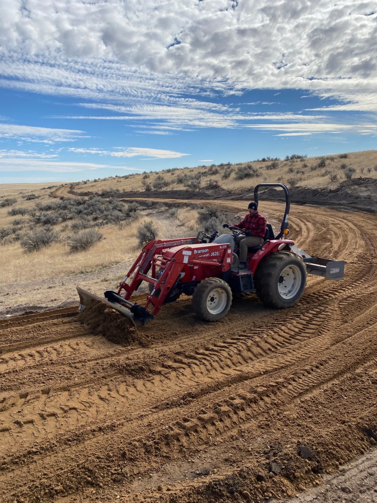 On Friday, Keith spent the day on the tractor while truckloads of pit run were brought in. We are mostly finished with the driveway now; we’re deciding if we will make a bunch of little trips ourselves with my dad’s dump trailer (holds six ton) or hire a dump truck driver for the last few loads (holds 26,000 ton). Regardless, the road that’s done so far looks and drives great for the most part; Keith still has a few little spots to patch up and flatten. It’s a relief with rain coming next week!