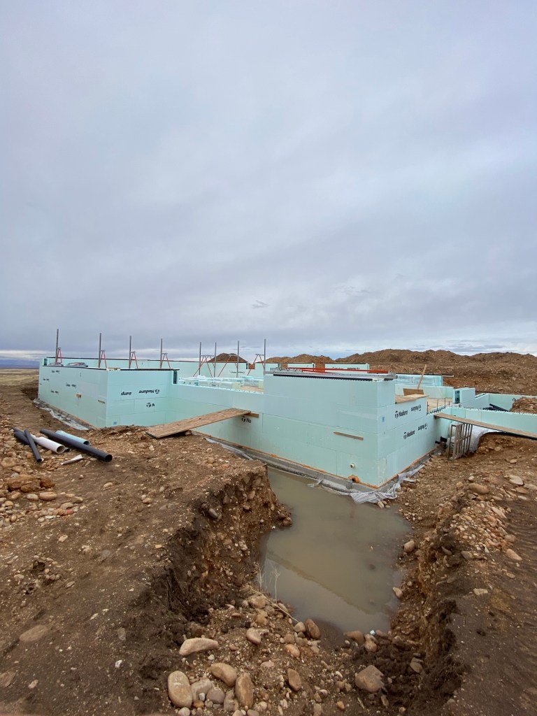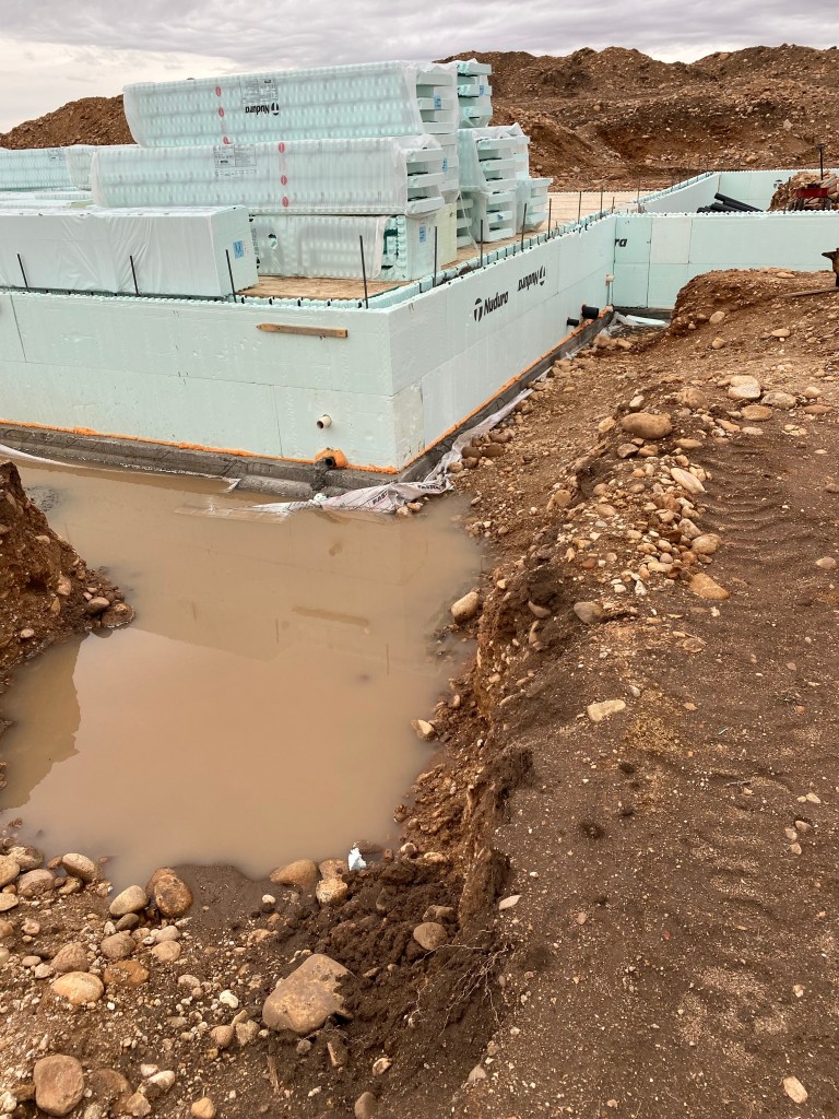 After our dusting of snow, we warmed up and were pelted with rain. I wasn’t exactly expecting a moat when I walked out to our build site — but here we are. I guess that’s what I get for teaching citizens about making their house a castle when I taught crime prevention. For the record, I didn’t mean a literal moat.