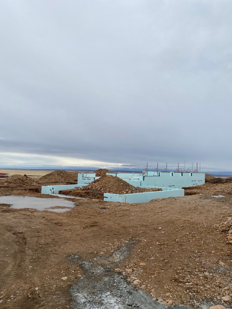 Despite the moat – and temperatures in the thirties – our exterior walls are going up. We were in a bit of a slow patch (crappy weather and our subcontractor had the flu) but we’re back in business. You can begin to see the outline of our windows – which is pretty cool to envision.