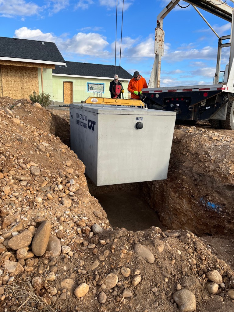 Next, the 1,000 gallon concrete tank was delivered and set in the hole. This doesn’t sound like much, but we’re talking several weeks of work.